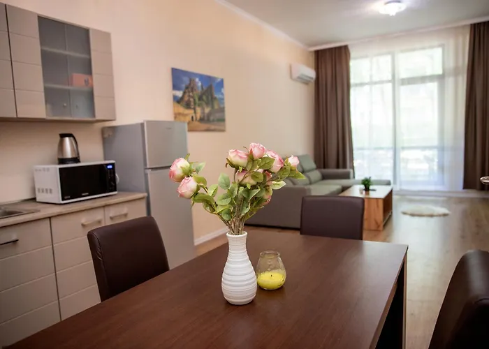Staying at the 85 m^2 Ramay Apart-Complex, guests can relax on a terrace around 6 km from Dolphinarium Aquarium. Featuring a Turkish steam room and a steam room, the 1-bedroom apartment is located a short distance from Monastery of Saints Constantine and Helena.